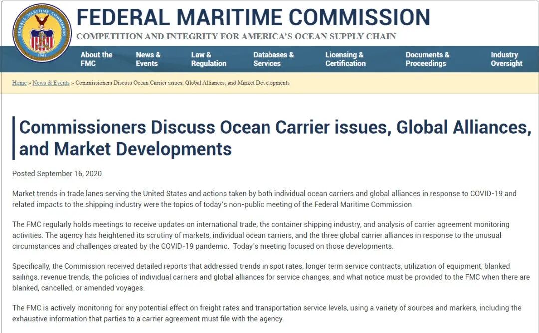 美国联邦海事委员会对疯涨的运费展开调查后发出警告 近几个月来,亚洲与美国东西海岸之间的运费达到历史新高。 此前,美国联邦海事委员会FMC已对各大联盟展开多个维度监控,包括停航运力占比及停航时间安排,各大联盟相关船舶部署会议记录,甚至要求停航计划必须提前15天报备,并警告如有必要将对停航发出禁制令! 9月16日,联邦海事委员会的专员召开非公开会议之后,向集装箱航运公司发出了警告,称如果有证据表明跨太平洋贸易存在串通行为,将向联邦法院提起诉讼。 美国联邦海事委员会表示,正在调查可能存在的违反竞争法行为。