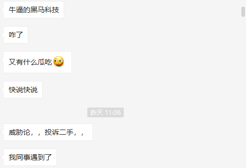 除了恶意篡改卖家产品图片,还有卖家反映其同事也遇到了黑马科技的“威胁论、投诉二手”。