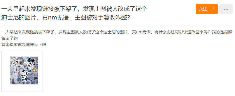 近日,有卖家在论坛控诉:一大早起来发现链接被下架了,发现主图被人改成了迪士尼的图片,真nm无语,有什么办法可以快速改回来的吗?我的是品牌备案了的。