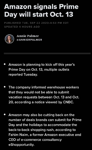 相比之前传言的10月3号,似乎卖家们更期盼是10月13号开始Prime Day,因为这意味着部分卖家可以安心的放个国庆长假(如果不是,就当我没说