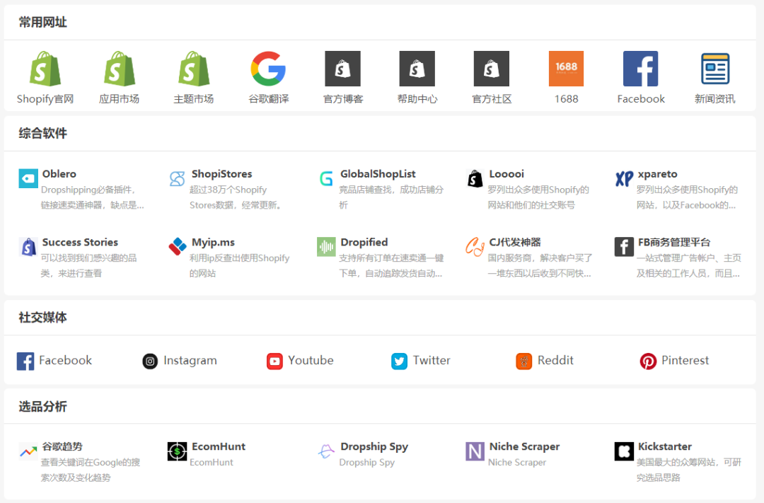 Shopify123导航,为独立站卖家提供了常用网址及独立站导航、综合软件、社交媒体、选品分析、收款方式、Saas建站平台、SEO工具、社交营销、网红营销、EDM营销、广告代理、推荐插件、博客论坛等十余项独立站运营的日常所需。