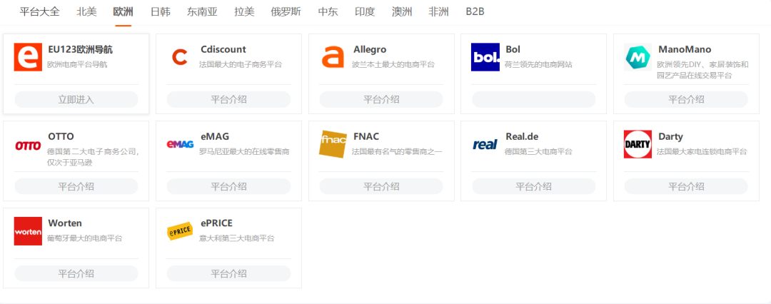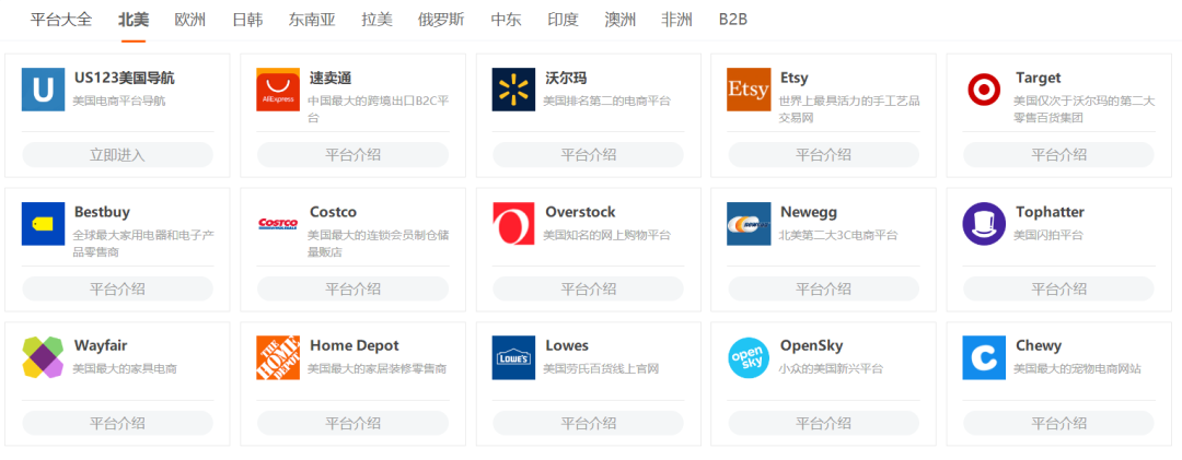 此外,卖方通特地将北美、欧洲、日韩、东南亚、拉美、俄罗斯、中东、印度、澳洲、非洲等各个地区或国家的热门平台罗列了出来,且每个平台下方都有平台简介,可以方便大家找到自己想要了解的平台。