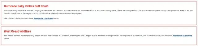 USPS(美国邮局)官方网站发布的通知显示:由于野火和大风,邮政局暂时关闭了加州、华盛顿和俄勒冈州的几家邮局。