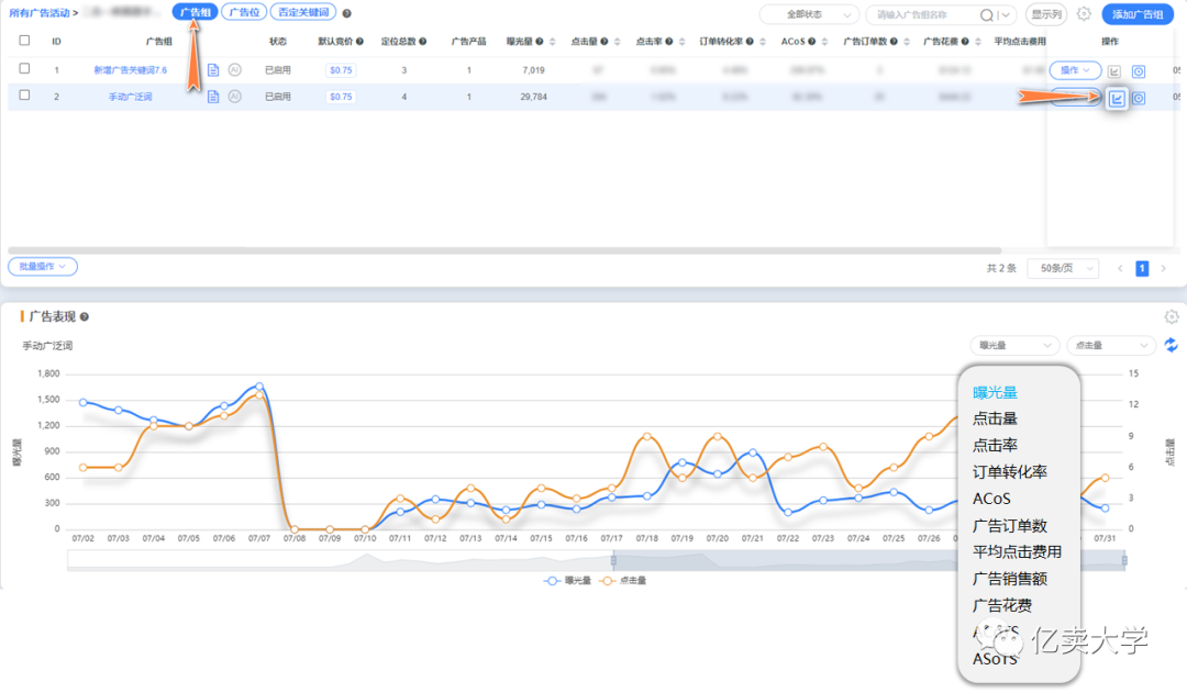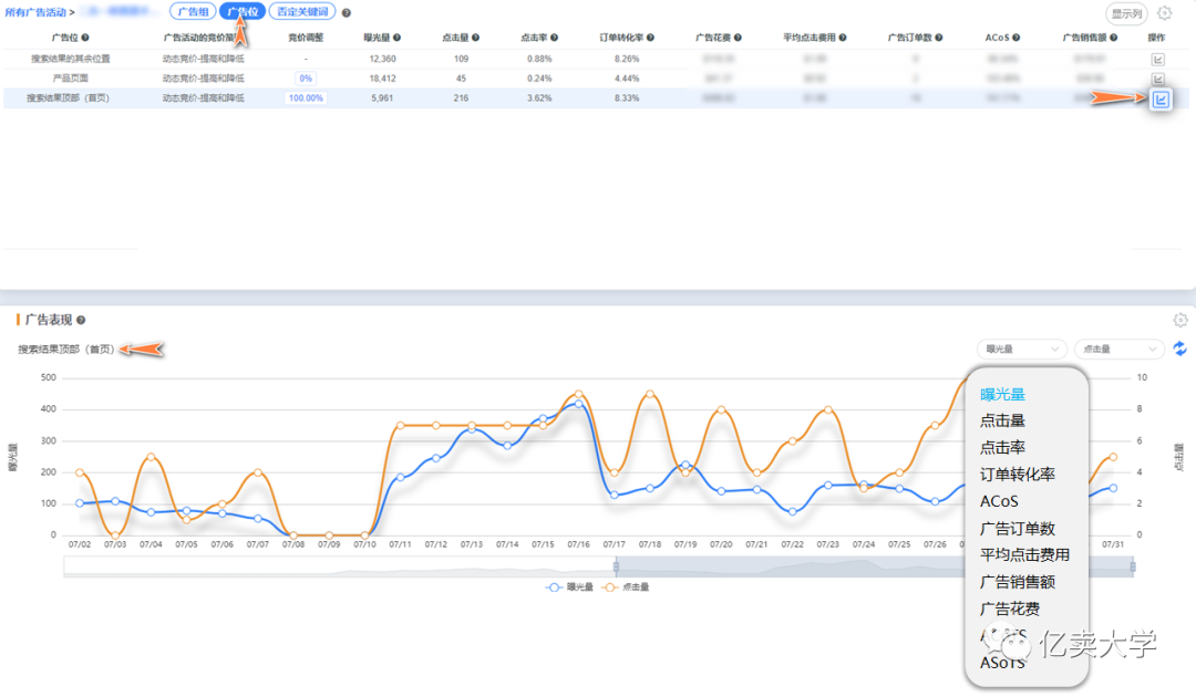 同时在每个层级:广告活动、广告组、广告位、投放、搜索词这5个层级上均可根据时间查看广告表现趋势,便于用户从不同维度分析广告优化的效果。