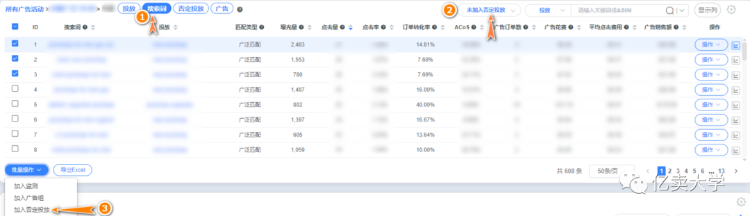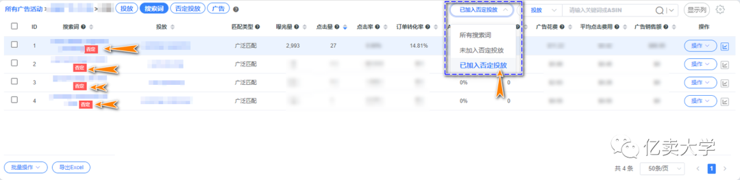 用户可直接在搜索词面板进行否定。筛选“未加入否定投放”可查看未否定的搜索词,数据会更清晰。