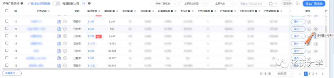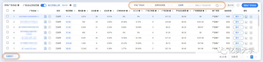 系统提供了多种筛选条件方便用户快速查找对应的广告活动,同时支持批量操作。