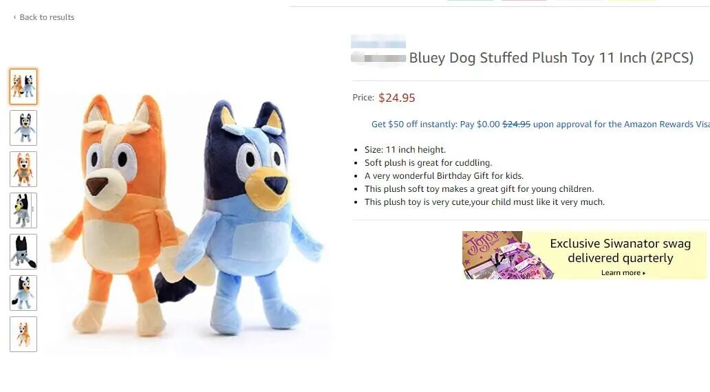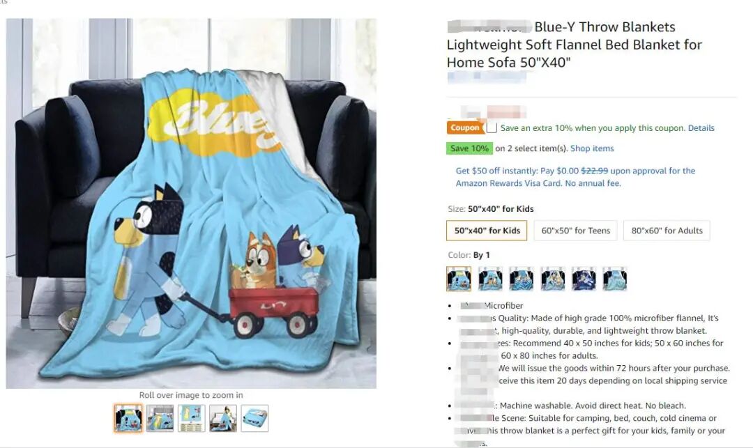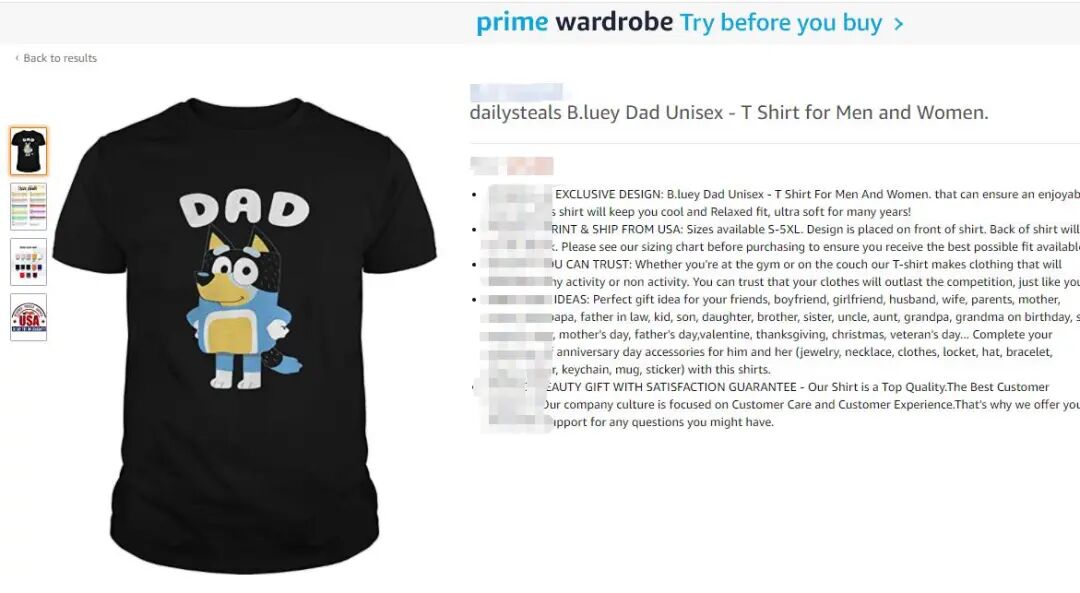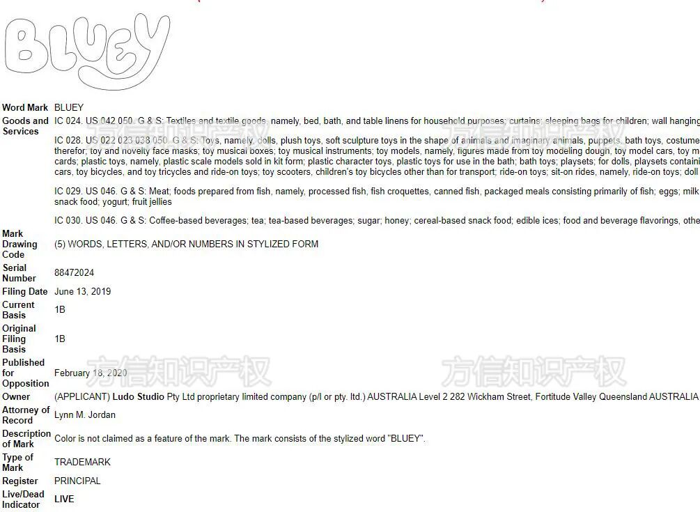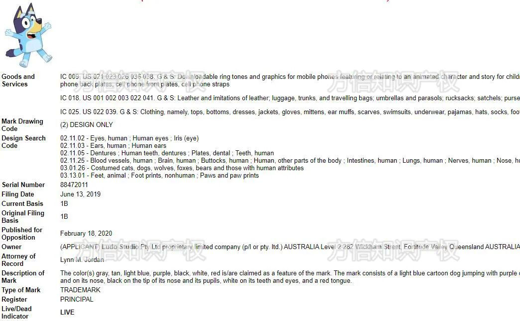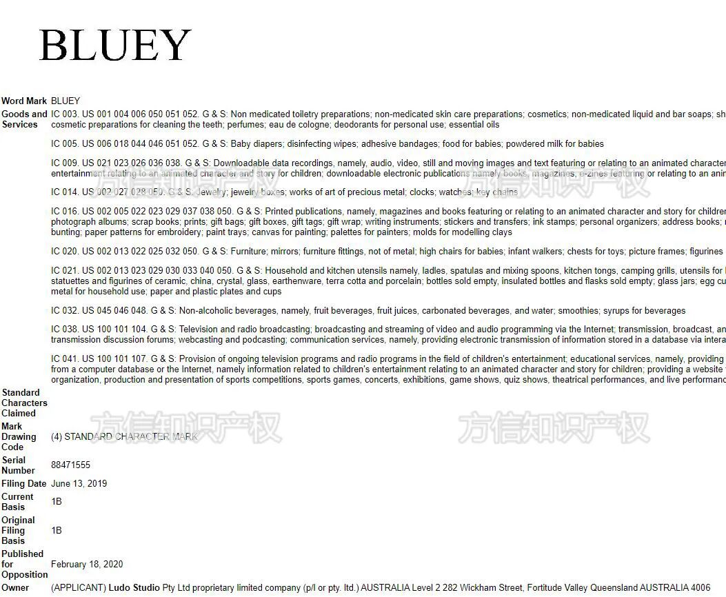 比起大名鼎鼎的小猪佩奇一家,《布鲁伊一家》这个澳洲动画片在国内知名度甚低。然而,它获得了 2019 年的 “杰出儿童剧大奖” ,在欧美国家非常受欢迎。 小信发现动画片的剧照,主角的形象都成为了吸引消费者的卖点。那么,卖家们应该注意哪些容易侵权的细节呢? 首先,小信先跟大家科普这部动画片《Bluey》以及 Bluey 形象的商标注册情况。如下图所示,无论是片名还是形象,都是有注册商标的。小信也提醒各位卖家朋友们请勿擅自使用,避免侵权事件的发生! (Bluey 美国商标) (Bluey形象商标) 根据前面的科普,小信发现 Bluey 的文字商标注册了多个产品类。其中热门产品有 24 类毯子被子和 28 类玩具,而形象图形商标主要是使用在服装上和玩具造型。 于是,小信通过 Bluey 在亚马逊上搜索,发现匹配到最多的产品是毯子相关的产品,其次就是衣服和玩偶。如下图: (亚马逊刊登举例-毯子产品 ) (亚马逊刊登举例-衣服) (亚马逊刊登举例-玩偶) 小信根据以往的经验,总结了一些关于如何避免侵权的建议给各位卖家,避免发生侵权事件。主要有以下几点: Bluey 的商标侵权集中在毛毯、衣服和玩具三大类产品上 直接印刷 Bluey 形象或者剧中场景图在产品上,都有可能造成侵权 在标题中出现有 Bluey 单词的变形,例如 B. luey 和 Blue-Y 等等