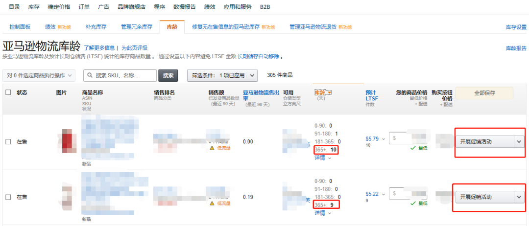 卖家可通过以上链接查看亚马逊物流库龄。首先要重点查看超过365天的库存,因为这些商品会产生长期仓储费,减少此类商品不仅有助于提高IPI分数,也可帮助降低仓储费。