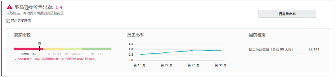 卖家可通过以上链接查看亚马逊物流售出率,如果售出率低于2或属于“一般”等级,就需要想办法提高该数据。比如针对售出率较低的产品,可以参加“清仓促销”,或者降价销售。至少努力达到良好等级,从而帮助提高IPI分数。