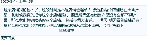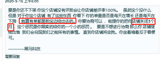 如此“霸道”的语气听起来竟有些耳熟,小编翻看了此前被迫关店的卖家于8.27收到的威胁信,原来黑马科技早就有过同样的发言。
