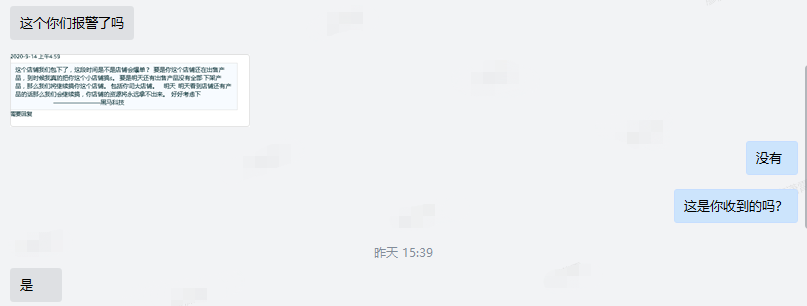 小编于9月15日再次联系该卖家,其表示自己并未下架店铺商品。当小编询问有再次收到对方的威胁信吗?卖家表示没有。