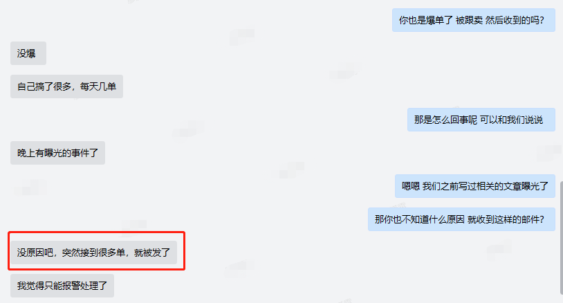 对方表示自己的朋友也遇到了,但并不是因为突然爆单,而是因为排在商品类目的前几位就收到了威胁信。