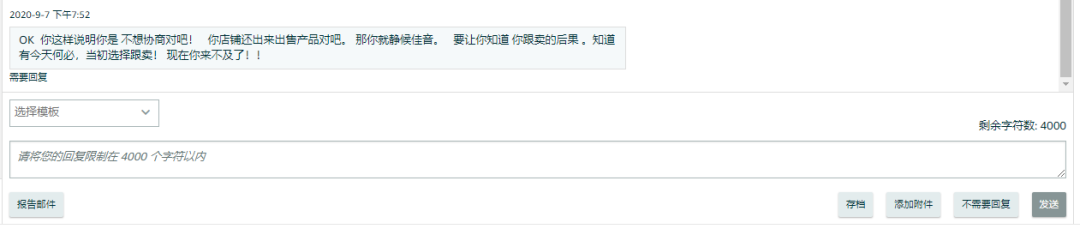 9月7日,卖家再次收到威胁邮件:OK 你这样说明你是不想协商对吧!你店铺还出来出售产品对吧。那你就静候佳音。要让你知道你跟卖的后果 。知道有今天何必当初选择跟卖!现在你来不及了!!