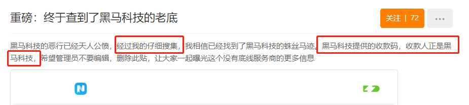 9月17日,有卖家在论坛发帖:终于查到了黑马科技的老底。帖子内还附上了带有“黑马科技”头像的微信/支付宝付款页面。