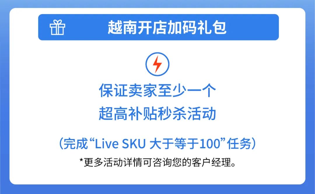 除了以上的三大奖励外,越南站点再加码,白送秒杀位还不够,还要给卖家巨额补贴,不仅能收割流量,还能大赚一笔!即日起至10月16日,成为越南自营新卖家,并顺利完成越南站点自营卖家新手任务,就能获得越南站点特别流量加码礼包,超高补贴秒杀活动免费送!