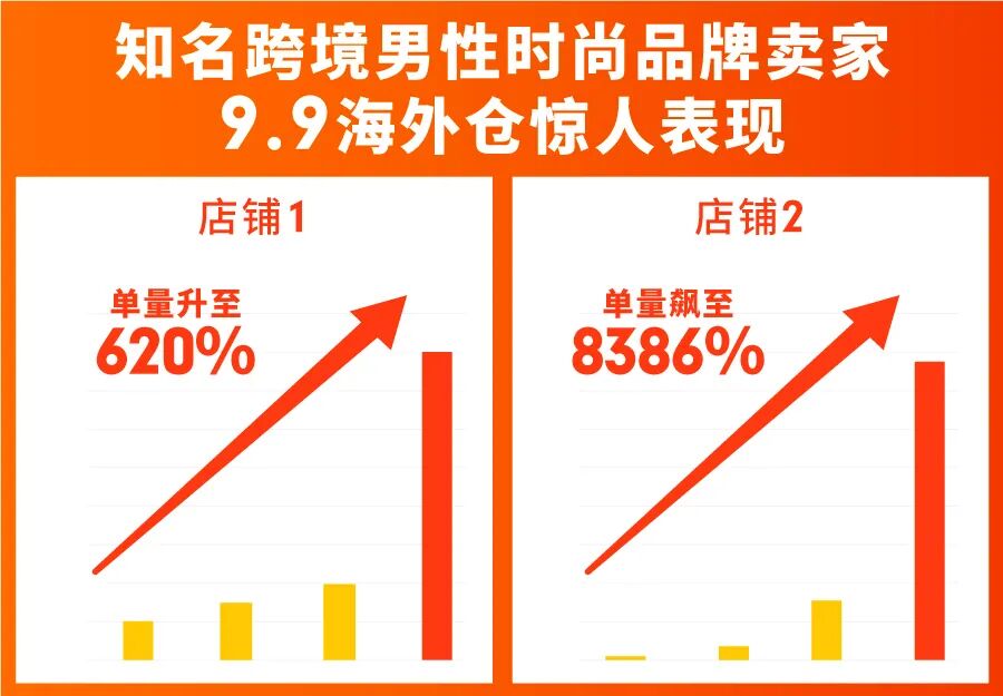 某知名跨境男性时尚品牌卖家在Shopee印尼站点开启两个海外仓店铺,其中一家9.9当天单量较七月时翻升至620%,而另一家店铺单量更是冲到惊人的83倍!