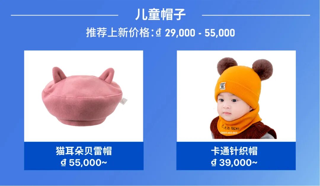 儿童的保暖一般会比成年人做得更充分一些:如在越南偏北部,气温还是会随着秋冬季的到来有明显的下降,因此足够厚的帽子也是御寒的极佳选择。根据平台观测,近期贝雷帽与针织帽的热度有见长的趋势,丰富的颜色(粉色、米黄色、棕色、卡其色等)以及卡通的造型也是儿童帽子的加分项。