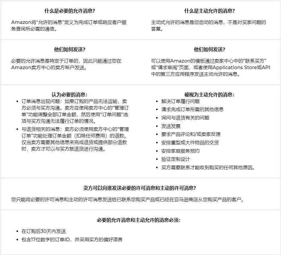 自2020年9月20日起,卖家将自动加入FBA捐赠计划。当你在法国手动或通过自动处置冗余库存时,可以将符合条件的库存捐赠给慈善机构,需要支付常规处理费。 亚马逊与当地慈善机构合作,旨在通过该计划帮助卖家消除捐赠过程中的供应链、语言和成本障碍,卖家还可能受益于捐赠的特殊增值税豁免。 慈善机构名单及更多信息,请参见FBA捐赠计划: https://sellercentral-europe.amazon.com/gp/help/GVCFMKLPUTBXE7L5(复制到安全浏览器环境下打开) 卖家可以在任何时候通过在FBA设置中禁用来选择退出此计划: https://sellercentral-europe.amazon.com/gp/ssof/configuration/index.html/ref=xx_fbasettings_dnav_xx(复制到安全浏览器环境下打开) 二 退货退款政策变更 2020年9月30日起生效 自2020年9月30日起,亚马逊将更新卖家完成的退货退款流程。当客户没有收到退货的全额退款时,他们可以获知原因。该政策变更将使卖家轻松地处理退款并向客户提供所收取的补货费用的可见性,还可以对退回商品的状况进行评分。 在亚马逊退货政策范围内被退回且处于原装状态的商品,将不再有资格获得补货费。只有不按政策和/或处于使用或损坏状态的商品才有资格获得补货费。 收取补货费的准则是基于商品状况和商品类型。如果由于损坏、丢失或实质不同的退货而要收取补货费,则需要对退货商品进行评分。大于或等于20%的补货费用将要求你上传商品的照片。新的退款工作流程使你能够直接在卖家平台中计算补货和运输费用。 需要注意的是,你仍然需要在收到退货后的两个工作日内退款。如果你不采取任何措施,亚马逊可能会将评分默认设置为“Sellable as New(可出售为新产品)”,并自动为客户退款。 更多详情,卖家请访问后台收取补货费的指南获取帮助,有关新退款工作流程的其他详细信息将于9月底在卖家中心提供: https://sellercentral.amazon.com/gp/help/G201725780(复制到安全浏览器环境下打开) 三 自发货订单自动取消政策变更 2020年9月30日起生效 根据亚马逊近日发布的公告,“关于卖家自配送网络(MFN)订单自动取消的政策即将更改,如果卖家未在预计发货日期(ESD)后的30天内发货并确认订单,亚马逊将自动取消订单。” 自2020年9月30日开始,亚马逊将自动取消在“立即发货”通知电子邮件中规定的“发货日期”后的7个工作日内未发货和未确认的任何订单。 卖家可以通过修改Handling Time来设置此日期,但请注意,此日期是商品清单和结帐页面上显示的交货时间计算的一部分。 这对卖家意味着: 在“发货日期” + 7个工作日后自动取消的订单将被计入取消率(CR)缺陷,并将直接替代先前的“迟发率”缺陷。卖家可以在“账户状况”控制面板中监控这两个指标。 特此提醒:根据政策要求,卖家的订单取消率(CR)需保持在2.5%以下,以免账户停用,应买家的请求取消订单不会计入取消率缺陷。 四 泛欧FBA计划政策变更 2020年9月30日起生效 为了更好地满足预期的客户需求,亚马逊将自动在那些FBA卖家亚马逊账户销售商品时提供有效增值税号码的国家/地区启用FBA库存放置。 作为泛欧FBA计划的一部分,此次变更,卖家在选择库存存储国家时有更大的灵活性,亚马逊将从计划政策列表中删除“多国库存条款和条件”。 五 ASIN创建政策变更 2020年9月30日生起效 亚马逊正在添加与品牌所有者无关的卖家创建品牌ASIN的规则。 六 长期的市场公平定价和知识产权政策 这两项也将纳入亚马逊的计划政策,它们的内容和适用范围保持不变。 七 延长假日退货期政策 10月1日起生效 亚马逊表示,预计客户会在假期提早购物,因此将暂时延长假日退货期限。 根据退货政策要求,在10月1日-12月31日之间交付的大多数订单都可以在2021年1月31日之前退货。该政策包括卖家运送的订单和亚马逊运送的订单。 尽管大多数订单的退货期限都已延长,但它可能因类别而异。卖家可以在“退货帮助”页面上看到每个类别中的退货截止日期。 八 沟通指南政策变更 2020年11月3日起生效 卖家需要重点关注该政策,变更内容包括有关允许的消息类型,适当的内容和样式特征的说明,以便买家进行更清晰的沟通。 允许的消息类型: Necessary Permitted Messages(必要的允许消息) Proactive Permitted Messages(主动允许的消息) 这两种允许类型消息的相同和不同之处如下图所示: 点击查看大图 从允许的消息类型中我们可以看到,亚马逊将允许卖家索评,但在与买家沟通时,需要注意内容上有很多也是亚马逊不允许的。 允许的消息类型不能包含: 订单或运输确认(请参见下面的间接沟通); 仅说“Thank you”或如果买家有任何问题你会在这里提供帮助; 推广或促销信息,包括优惠券; 能够激励或说服买家提交正面产品评论或卖方反馈(seller feedback)的内容,包括提供补偿,金钱,礼品卡,免费或打折产品,退款,返利或报销,或未来的福利; 要求删除或更新现有产品评论; 仅当对产品满意才要求产品评论; 对产品Review或卖家反馈(seller feedback)的重复请求(每个订单)。 允许的消息不能包含以下信息: 外链(除非这些链接是为完成订单的安全工作链接或亚马逊的链接,链接应为https,而不是http); 除产品说明、保修信息、发票以外的附件; 包含或显示链接到卖家网站的logo; 退出消息的链接; 包含敏感内容的图片或文本(比如裸露的皮肤、暴力、脏话、攻击性语言) 带有追踪的像素或图片 电子邮件地址或电话号码 已购买产