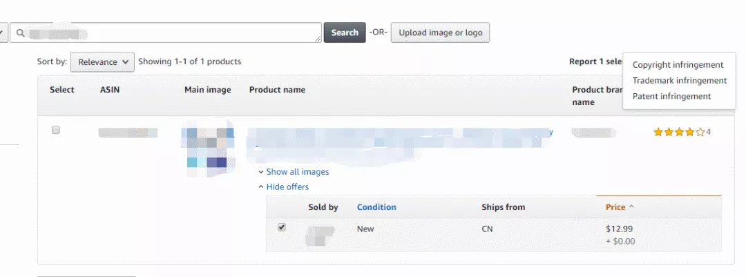 点击show offers, 勾选要投诉的卖家,然后选择Trademark Infringement。注意,一定要勾选跟卖卖家,不要勾选ASIN前面的那个框哦,否则整个ASIN都可能被移除。