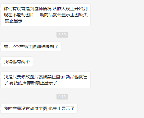 今天早上,在卖方通卖家交流群中,很多卖家表示自己的主图出现了“禁止显示”的警告,不管卖家是否修改主图,仍然被“禁止显示”。截止发稿前,卖方通卖家交流群中已有大量卖家表示中招!