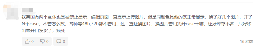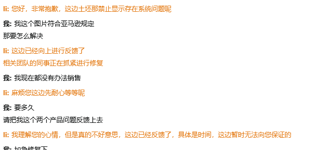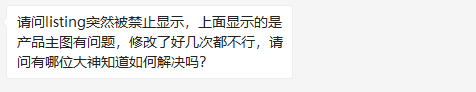 因为系统原因,卖家主图被“禁止显示”,给卖家的日常运营带来困扰,有卖家苦苦等待的秒杀活动也因此被浪费了一天,但截至目前,这个问题仍未得到解决,只收到一个英文case如下。