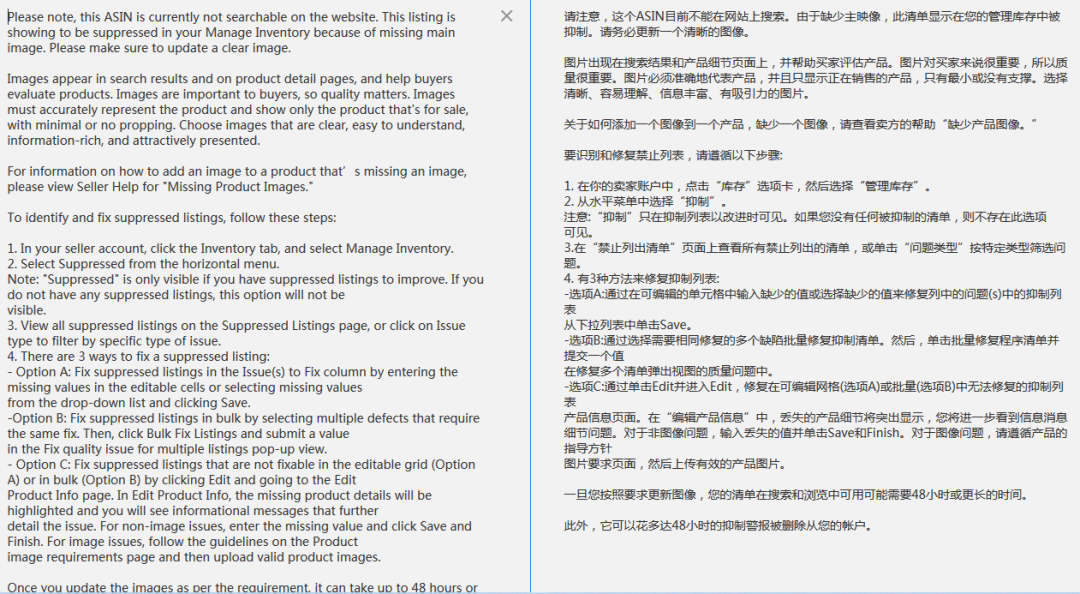 不管是新老产品,都收到被“SUPPRESSED”的显示以及首图警告:图片可以吸引买家的注意力,并帮助其决定是否购买商品。