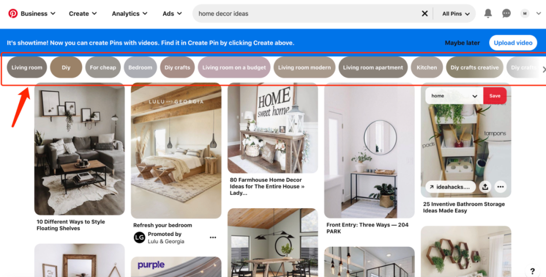 我们可以设置Featured Boards和普通Boards,Featured Boards相当于置顶Boards,合理利用可以获得更好的转换效果。Boards可分为不同品类进行设置,因为Pinterest是使用图钉也就是Pin去分配素材给受众,合理、细致化的分类可以帮助Pinterest进行Smart Feed的搜索算法分配,可以更好的将产品和图片推送给相关兴趣的人群如家居类可以根据不同的房间、用途分为:桌面用品、厨具用品、阳台装饰摆件等。由于Pinterest是具有高度搜索引擎性质的,所以优化关键词对于展现和正确受众的分配有着致命的决定权。关键词可通过在搜索栏,搜索关键词后下方的自动找寻的相关关键词进行拓展。Promoted Pin是Pinterest广告系统,收费模式则是竞价模式,可以设置自定义受众群体。通过Promoted Pin,我们可以付费让自己的Pins展示在目标用户的Feed流中,它可以是图片或者视频,可以指定投放关键词和目标人群。这四项都会影响Pinterest的排名,可以看出Pinterest整体风格都是较为简约、极具艺术风格的。所以质量差的账户和广告会因为影响Pinterest的整体用户体验,从而展现少、排名低。