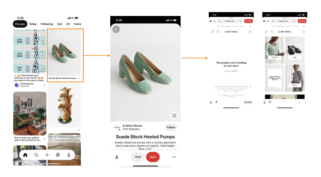 首先讲一下,Pinterest如何引流,是如何进行跳转的。Pinterest上的每个大头针图片,实质上都是指向您网站的直接链接!以上这个图片是小编临时的截图~可以看到每张图片都没有广告或是AD之类的标识。当你点击图片后,可以看到每张图的放大版的清晰图片而在点击相应的大图后,可以跳转到外链,独立站等落地页,将用户引流到你的网站中。可以看到上图,跳转后显示我想看的这双鞋无法从这个网站购买(可能是下架了,也有可能是用这双鞋的图片吸引用户,实际上网站并没有这双鞋),但是网站也相应的提供了continue shopping继续购物的选项,被引流来的客户可以继续浏览网站里其他的产品。