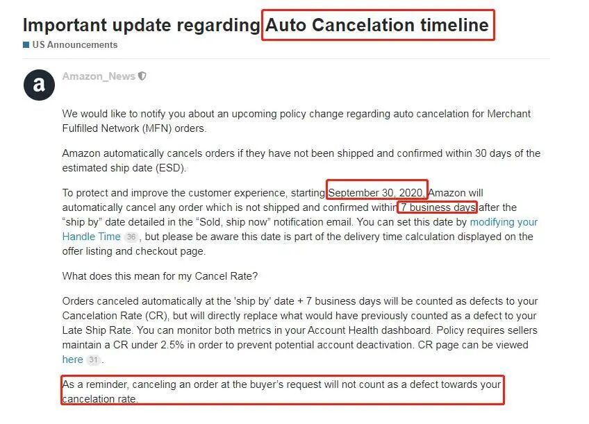 这几天亚马逊又发布了新的政策,规定了自发货订单自动取消的政策。如果自发货订单超过预订发货日期未发货,则会在7天后被自动取消,并计入订单缺陷率中。 PS: 订单缺陷率(ODR)指衡量卖家提供良好买家体验能力的主要指标。该指标涵盖在限定的六十天时间内出现的缺陷订单占所有订单的百分比。订单缺陷率由各指标组成,其中包括卖家订单取消率 公告内容告诉我们: 卖家自配送网络 (MFN) 订单自动取消的政策即将更改,如果卖家未在预计发货日期(ESD)后的 30 天内发货并确认订单,Amazon 将自动取消订单。 为了改善客户的体验,从 2020 年 9 月 30 日开始,亚马逊将自动取消在“立即发货”知电子邮件中规定的“发货日期”后的 7 个工作日内未发货和未确认的任何订单。卖家可通过修改 Handling Time 来设置此日期。但请注意,此日期是订单结帐页面上显示的预计送货时间计算的一部分。 新的政策还更新了:“发货日期”+ 7 个工作日后自动取消的订单将被计入订单取消率(CR),会直接替代先前的“延迟发货率”。卖家可以在“控制面板”监控这两个指标。亚马逊要求卖方将取消率保持在 2.5% 以下,以防止面临账户停用的危险。 需要注意的是:应买家的请求取消订单不会计入订单取消率。 卖家的关注点是什么? 现在国外物流问题还严峻,货物发货的时效问题也会产生,7 天自动取消订单的情况下,容易让卖家在等待货物入仓的时候就面临发货超时的风险,时间短暂,如若在这几天内联系买家取消订单,但因订单处于待处理状态,买家信息无法显示也很难处理,而这也将直接影响卖家的取消率。 亚马逊上所说的取消率(CR),适用于卖家自配送订单,指标指向所有卖家取消的订单,但不包括像上述所说的买家在亚马逊上直接取消的等待中订单。 规定需要卖家 CR 维持在 2.5% 以下,卖家商品才能在亚马逊销售,否则 CR 高于 2.5% 账户可能将会停用。 这也意味着卖家要及时的发货!虽然不知道现在使用空的订单号发货,是否可以弥补无法按时发货的情况,但亚马逊向来严格,会实时监测订单真实性,卖家还是需要做到按时发货。