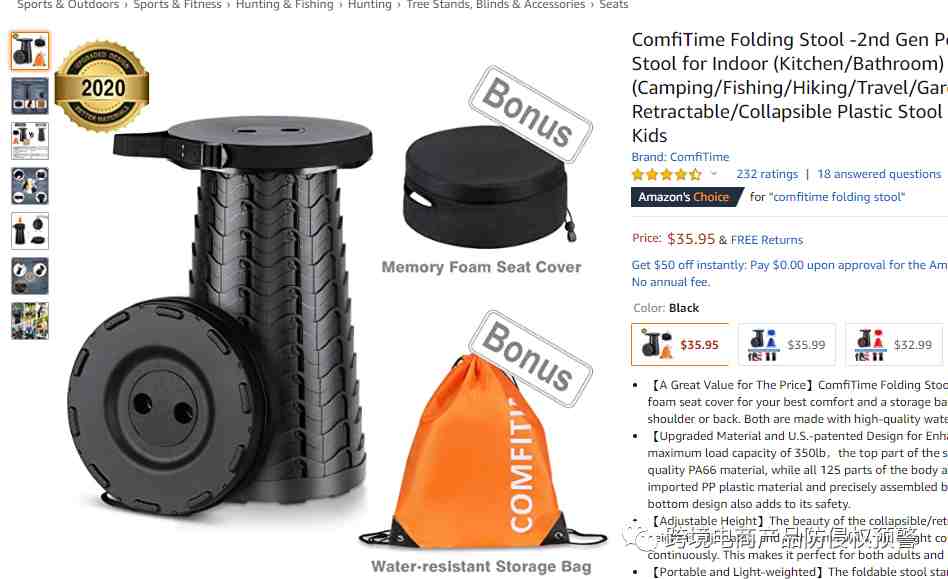 下面这款折叠凳,目前它是亚马逊美国站的Amazon's Choice,留评232: