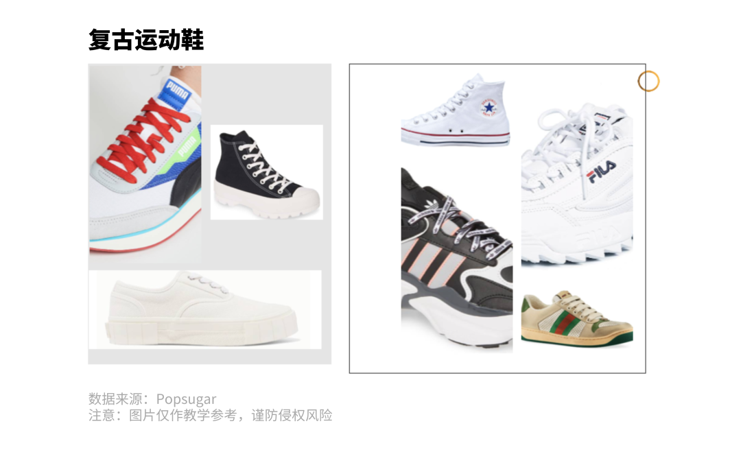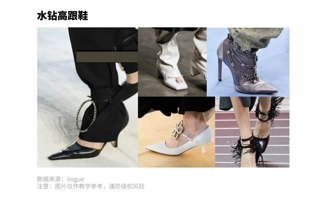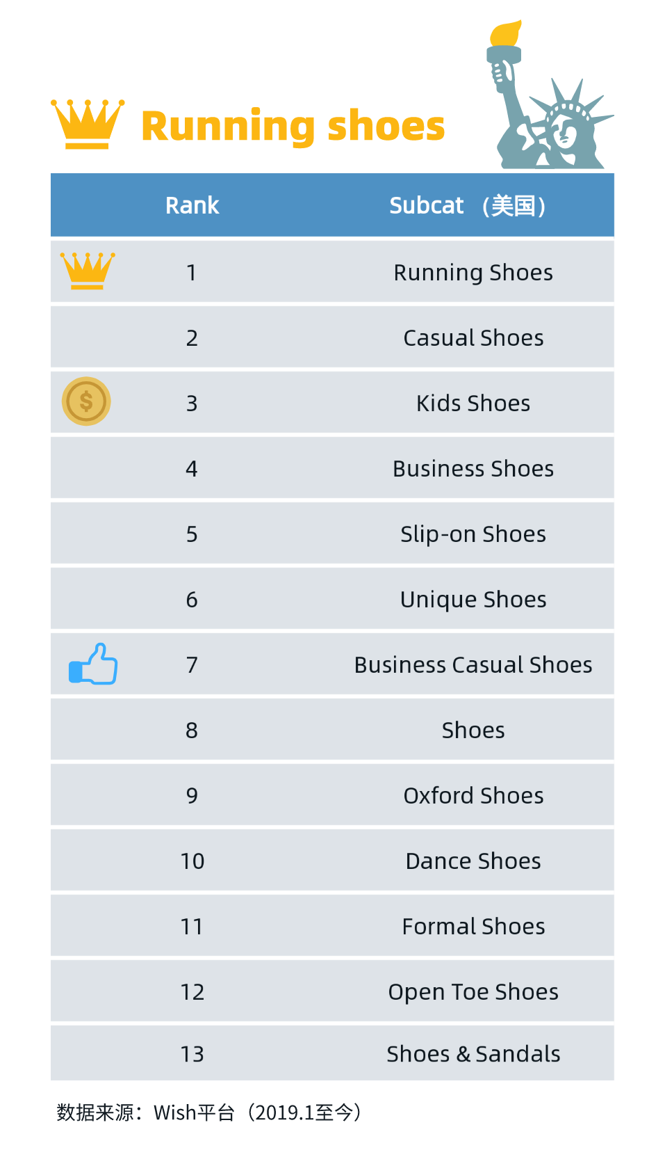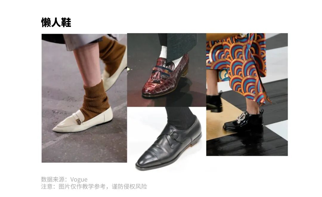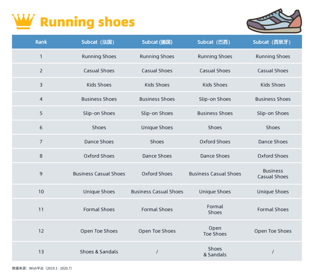 从小白鞋到老爹鞋,从“囤鞋热”到“全民抄鞋”,2020,鞋靴界正在吹什么风? 一方面,鞋靴推陈出新的速度一点也不比服饰来得慢;另一方面,一款潮鞋统治消费者时尚审美的周期通常能达到数年。 因此,如果商户能在快速更迭的鞋靴时尚中选中一款未来的时尚爆款,往往能躺着吃好几年的时尚红利,堪称鞋靴界的“优质资产”。 话不多少,一起来看看2020年鞋靴时尚都有哪些新花样吧! 回顾 X 2019鞋靴数据 SHOE TRENDS 美国:跑步鞋最热销! 美国地区鞋靴子类目平均价格排名中,Kids Shoes是最高的,价格高达42美金左右;Running Shoes、Business Shoes和Oxford Shoes紧随其后。 GMV排名位于美国前十的鞋靴子类目中,竞争程度小,给商户带来的价值相对更多的是Business Casual Shoes。 根据谷歌趋势的结果,从2015至2020年期间,美国消费者对Kids Shoes的需求量,在七月至八月,以及圣诞节期间最多;Dance Shoes在九月份的销量最佳。 此外,从2015至2020年期间,Business Casual Shoes在美国的热搜指数呈现整体上升趋势。 英国:对商务鞋情有独钟 无独有偶,英国地区的Running Shoes月均GMV排名最高,其他鞋靴子类目排名与美国大抵相同。 就平均价格而言,Kids Shoes的平均价格最高,高达35美金左右;Business Shoes、Business Casual Shoes和Oxford Shoes则紧随其后,最后是Running Shoes和Casual Shoes。 由此可见,美国消费者偏好运动休闲风格的鞋靴,英国消费者的钟爱的鞋靴风格则更加商务。 GMV排名位于英国前十的鞋靴子类目中,竞争程度小,给商户带来的相对价值相对更多的是Formal Shoes,可谓隐藏的潜力鞋靴子类目。 根据谷歌趋势显示,从2015至2020年期间,Running Shoes在圣诞节前后达到高峰。 同等条件下,Kids Shoes分别在八月份和感恩节&圣诞节期间呈现高峰。 其他:萝卜青菜各有所爱 上图为2019.1-2020.7期间,法国、德国、巴西和西班牙的鞋靴子类目GMV排名。 不难发现,各鞋靴子类目在美英和其他欧美国家排名情况相差不大,但各国消费者的价格接受度和鞋靴偏好有所差异,建议商户根据其不同市场需求开发产品、调整产品细节。 仅从消费者的价格接受度来看,美国 > 英国 > 法国 ≈ 德国 > 巴西 ≈ 西班牙。 法国最具潜力的鞋靴子类目为Business Casual Shoes;德国和西班牙最具潜力的鞋靴子类目为Formal Shoes。 2020 X 鞋靴趋势盘点 SHOE TRENDS 运动鞋 运动鞋是欧美各国的钟爱之选,常年蝉联鞋靴GMV榜单首席,哪些运动鞋款式牢牢地抓住了欧美消费者的心呢?一起来看看吧! 小白鞋 其实无论国内外,人们都对百搭舒适的小白鞋爱不释手。 白色板鞋、白色厚底运动鞋、白色帆布鞋都属于消费者认知的的“小白鞋”范畴。 厚底运动鞋 厚底自然是厚底运动鞋最大的亮眼之处,众多运动品牌会在底座上玩出花样。 例如上图所示的彪马厚底运动鞋,竖状条纹让厚底更添流动感,摆脱一般厚底鞋的厚重感。 趣味鞋底 除了竖状条纹,涂鸦、流线线条等花样都出现在了鞋底上,这让崇尚个性的年轻消费者有更多表达自我和审美的选择。 复古风运动鞋 高帮运动鞋靴、老爹运动鞋、彩色混搭运动鞋…… 各大知名时尚品牌纷纷推出复古鞋靴,诞生了众多一鞋难求的热门鞋款。 70-90年代的元素大量地被运用于运动鞋设计上,运动复古频频联想时尚头刊。 未来科技鞋 银灰配色、航空舱外形、网格线条、空气鞋垫…… 未来感十足的运动鞋已成为耐克、阿迪达斯等知名品牌橱窗中的科技武器,吸引深受科幻文化影响的年轻人的目光。 商务休闲鞋 矮胖型的韦力靴 憨厚可爱的韦力靴成为2020秋冬鞋靴趋势里的一抹可爱色彩。 当然,憨厚的韦力靴(Welly Boot)不仅仅是一款时尚潮靴,橡胶材质的它还兼顾了实用功能,尤其适合高纬度、多雨雪的国家。 水钻高跟鞋 无论是镶嵌水钻,还是珠宝点缀、串珠、铆钉,一双光芒四射的高跟鞋,绝对能搭配任何节日盛装,让成熟女性在圣诞晚宴上大放异彩。 镶嵌链条和金属球的高跟鞋 链条和金属球装饰在2020年的时尚界里一直是设计师追求的装饰。 尤其在秋冬季节,他们会被装饰在懒人鞋(一脚蹬的单鞋)和高筒靴的脚趾或脚腕部位,提升鞋主人与众不同的反叛气质。 懒人鞋 因为兼具舒适便利与商务休闲的多重功用,懒人鞋几乎是年年霸榜流行鞋款;流苏和水钻是常见的懒人鞋装饰。 多彩高筒靴 2020年,设计师一改以往的棕色、黑色等保守的色调,大胆地运用了黄色、蓝色、橙色等缤纷色彩为高筒靴上色,为现实世界注入更多活力与信心。 厚底高跟鞋靴&拖鞋 几何网格、绽放的印花……厚底高跟鞋如同一支彩笔,抹过大地,绚丽多彩。 疫情隔离模式改变了鞋靴潮流,设计师将目光锁定在拖鞋设计上,拖鞋成为2020鞋靴时尚的新宠。 男鞋 相比女鞋设计多点开花,男鞋设计就略显乏善可陈了。 将运动鞋与传统男鞋进行融合,并提供更多色彩和图案(动植物图案)选择,可能是唯二亮点值得商户关注的变化和尝试。 欧美消费者偏好 SHOE TRENDS 英美消费者的消费偏好有何异同? 哪些海外电商平台值得我们参考学习? 如何根据英美不同消费者的消费偏好着重选品? WATCH THE VIDEO 查 看 视 频 由于各国尺码标准不统一、知识产权保护保护程度高等原因,鞋靴、服饰等产品极易遭受退款和侵权,因此商户在选品、编辑产品时务必要甄别产品图案、logo和名称等细节。![]()