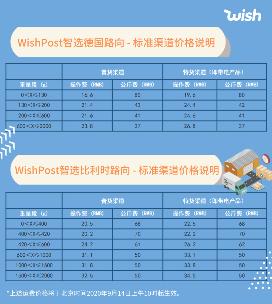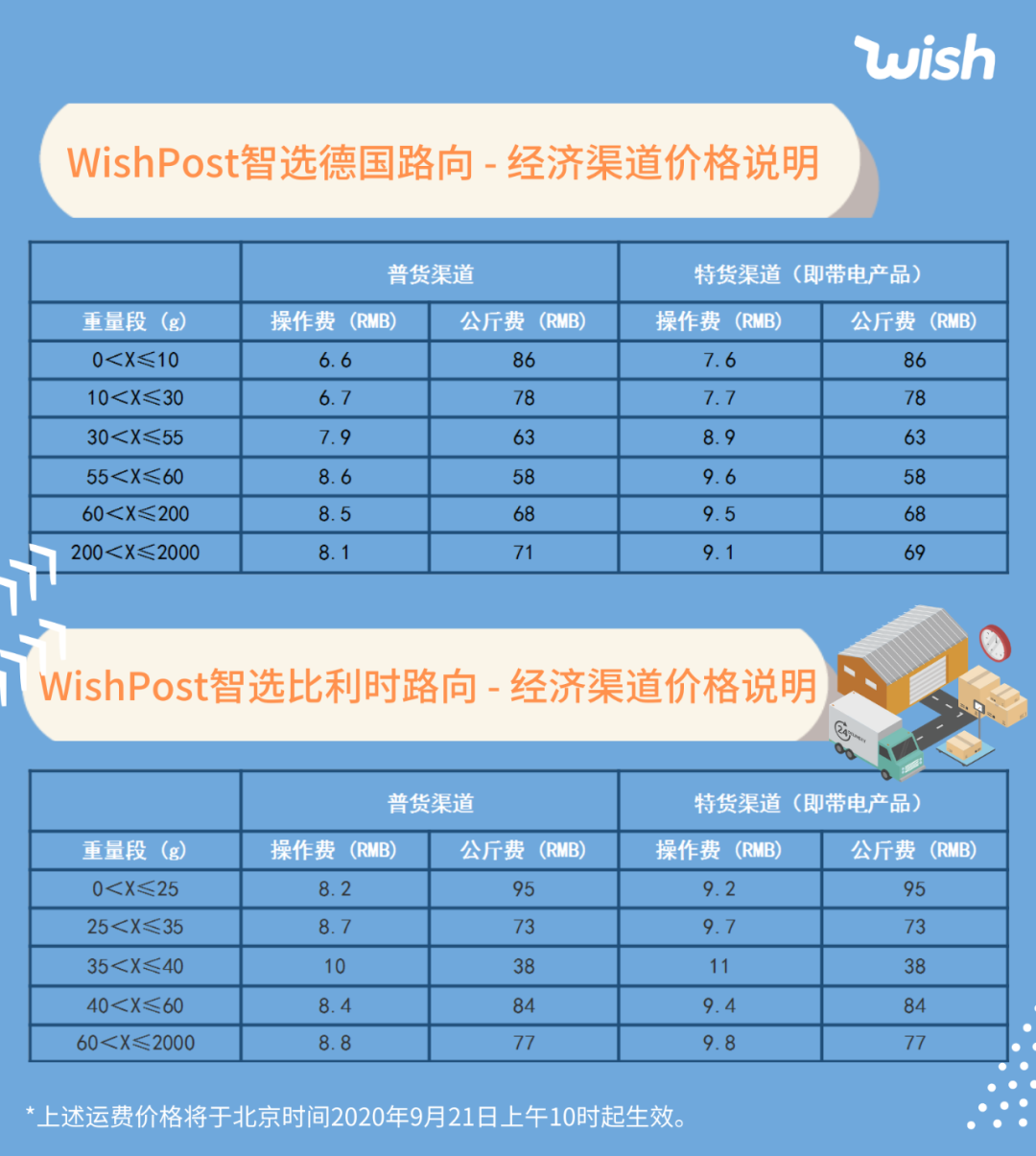 北京时间2020年9月14日上午10时起,Wish为WishPost智选德国路向、比利时路向新增以下两个渠道: