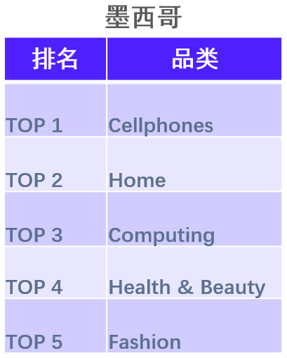 目前墨西哥站点与智利站点并列Linio平台营收最高。手机、家居、电脑、美妆健康、以及服装,分别为Lino墨西哥站点的五大品类。