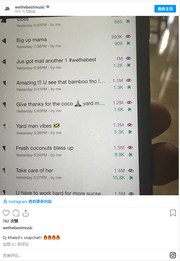 DJ Khaled 分享了一张照片,并且获得了大量的浏览量和截图量。