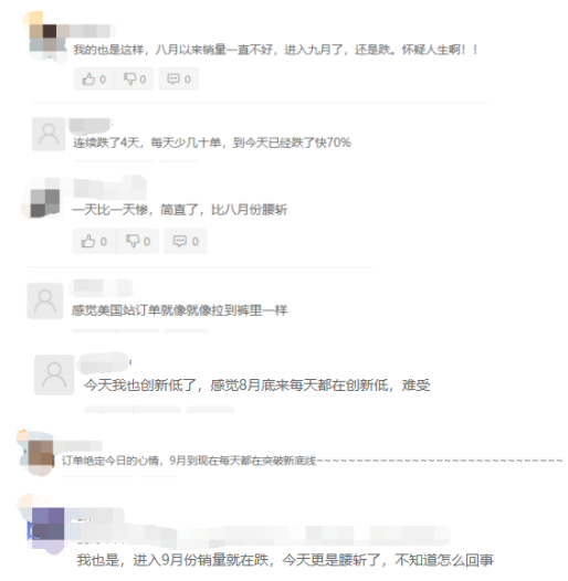 有卖家表示自己的店铺从6月份的500多单 到7月份的400多单 再到8月份的300多单 直到8月底到9月初已经200多单了,今天上店铺一看直接吐血,只有200出头了……广告费是一天烧的比一天高,单量是出的一天比一天少,心累啊……