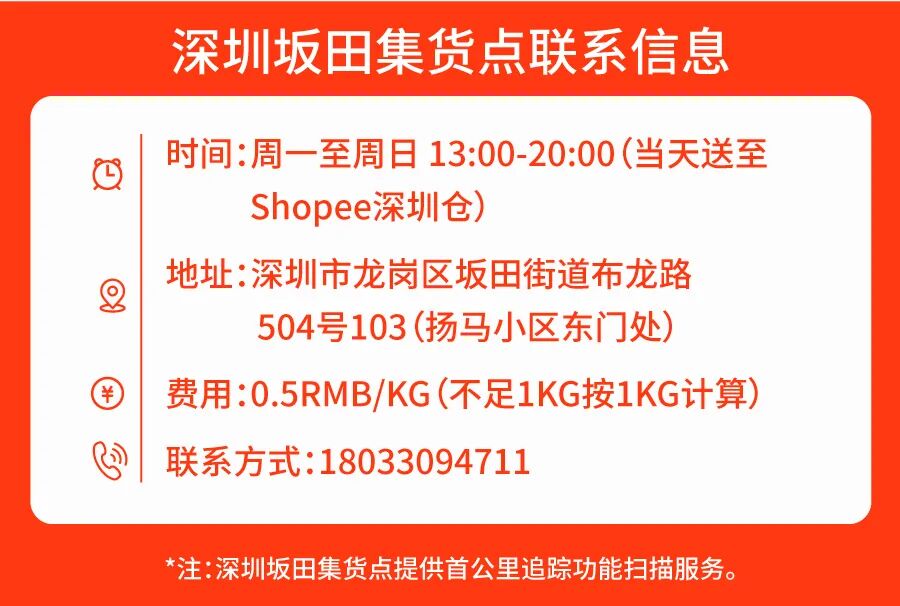 Shopee在广东省深圳市龙岗区坂田街道设立集货点,为卖家提供从集货点送货至Shopee深圳仓的服务。