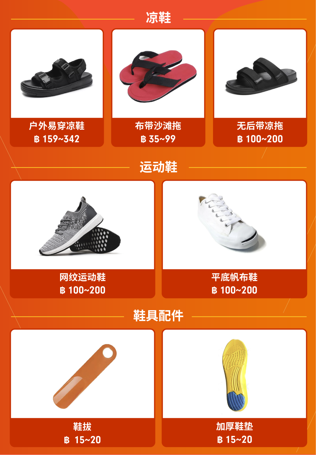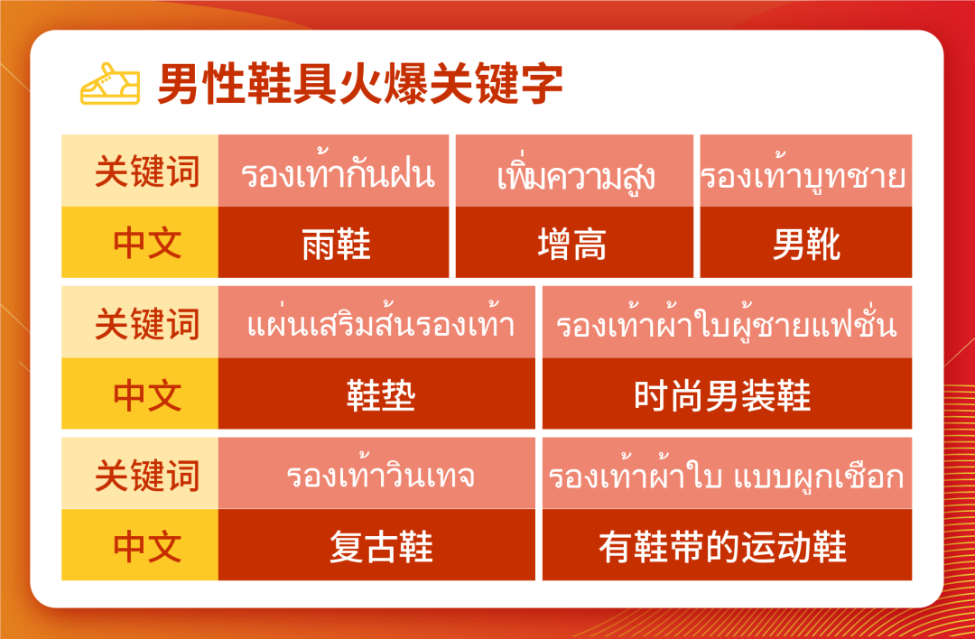 男性鞋具的TOP热搜品和女性鞋具相去无几,都是以凉鞋和拖鞋为主力军,再辅之以各类不同的运动鞋或是休闲鞋。运动鞋建议上架透气的网格鞋为佳,休闲鞋是用经典的“白饭鱼”帆布鞋,在具体鞋身图案上可以有所差异。雨季鞋垫的消耗也会比旱季更多,相关卖家还可上架透气、加厚的鞋垫,以“套装”或“多件”作销售手段。