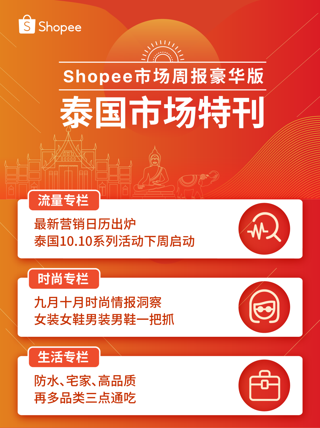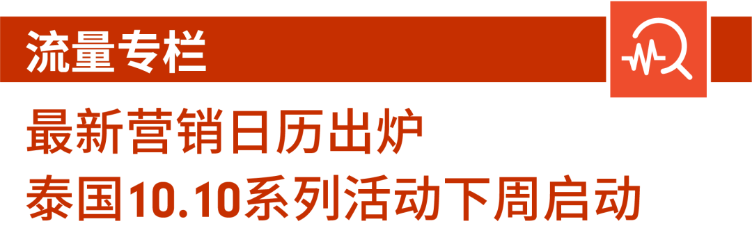 以上就是Shopee市场周报豪华版——泰国特刊的全部内容,先抓紧把泰国站点活动玩法截图收藏,研究推荐品类,报名活动上新测爆!Shopee各站点10.10系列活动也将同步拉开序幕,9.9余热尚在,10.10再为旺季添把火!下期Shopee市场周报继续约定您!