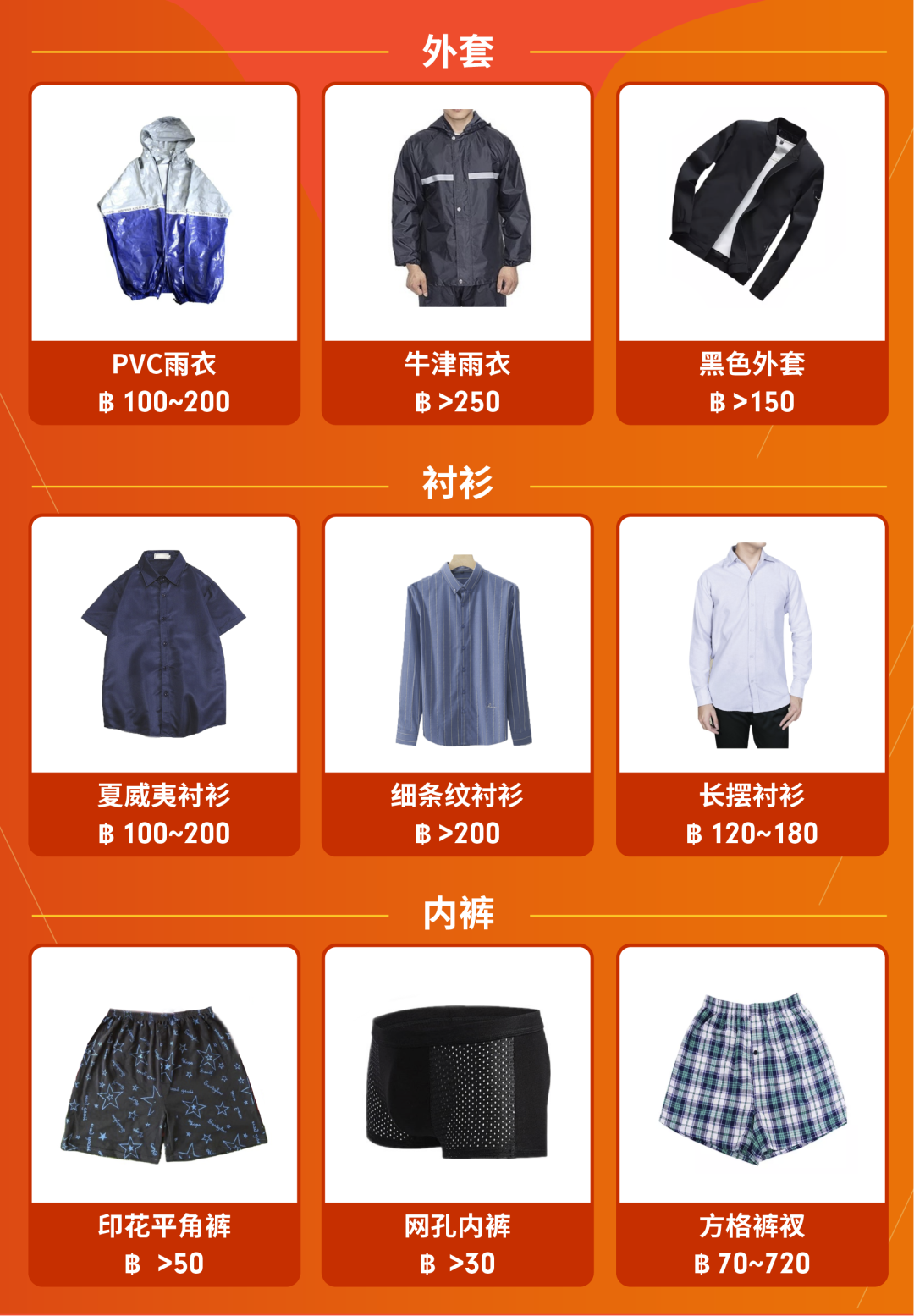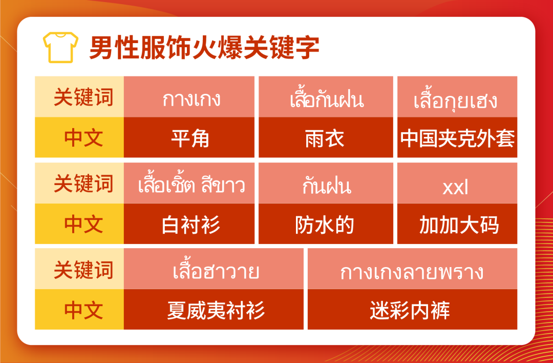 日常工作装还是要配齐的——泰国男生更偏爱宽松大码的衬衫,与当地流行的高腰修身下装设计相得益彰:中式编纽衬衫或是夏威夷衬衫都非常符合这样的主题。出门后,轻薄的衬衫也让外头套件厚重的雨衣,没那么痛苦难忍。为了对抗这种潮湿闷热的天气,准备多几条干爽的内裤自然也是必不可少的:除了大火的的冰丝内裤外,网状平角内裤或是偏老式的大裤衩都会是让买家心动的首选。