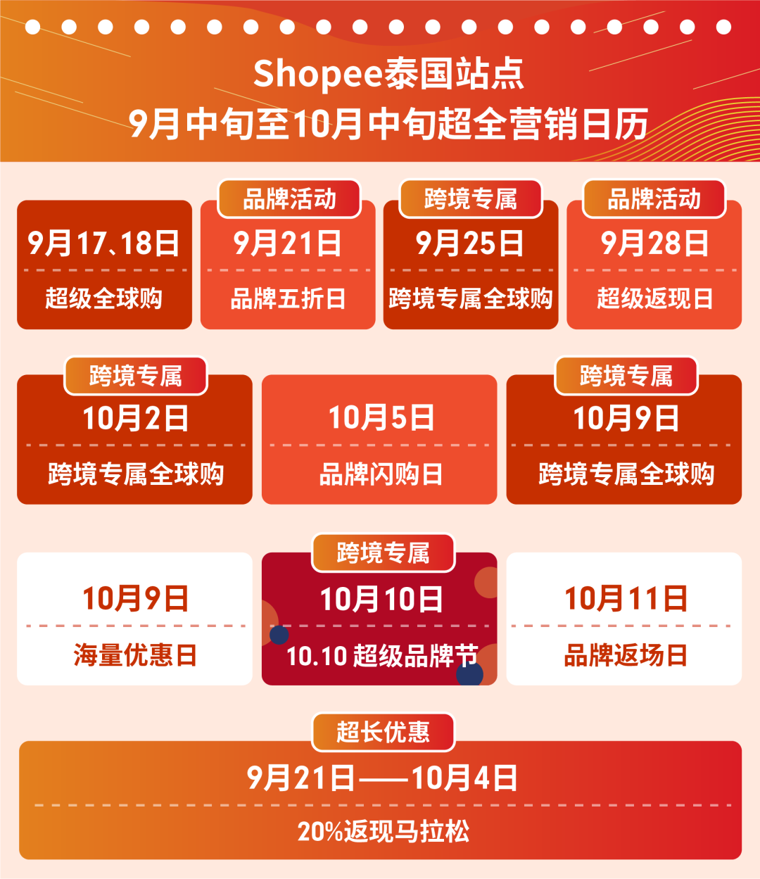 9.9超级购物日顺利落幕,Shopee 10.10超级品牌节又将完美接档!泰国站点从九月中旬起就将上线多场特别营销活动为10.10预热,包括数场跨境专属活动、超时长返现马拉松、一整天的五折活动和闪购活动等你参加!活动速速安排上,最强流量首页位等你收割!