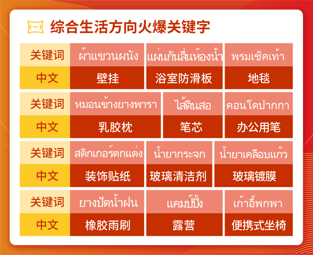 综合生活方向中包含较多各异的子类目(家居生活、文具&图书、汽车用品、运动&户外等),虽然表现亮眼的热搜各异,但它们主要还是紧紧围绕近期的几个大市场趋势:①雨季防水;②保证在家工作效率;③提高生活品质。各位卖家小伙伴们在做综合生活方向类目的选品或选词时,建议多考虑并有机结合以上的三个趋势。