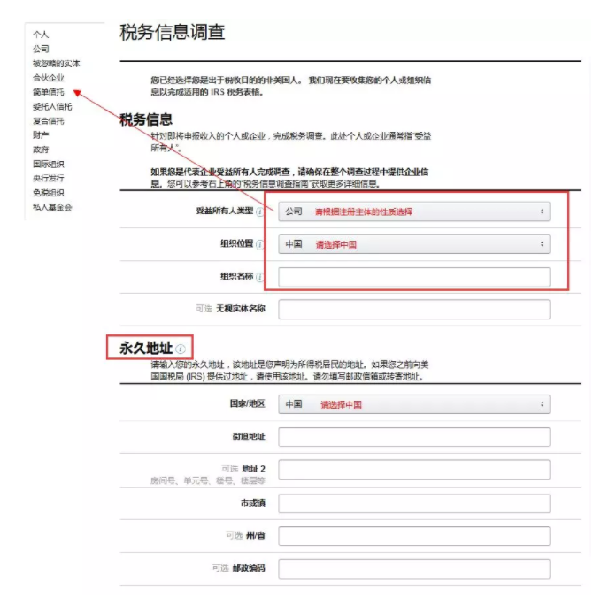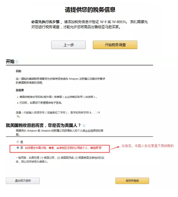 卖家只需选择“非美国身份“即可,这样就可以免去税务难题了。