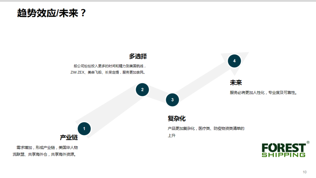 我相信大家已经看到这个行业的一些未来趋势或者说目前已经形成的现象,比如在美国的末端派送,已经出现了一些产业联盟,海外仓资源共享,剩余卡车板位共享。
