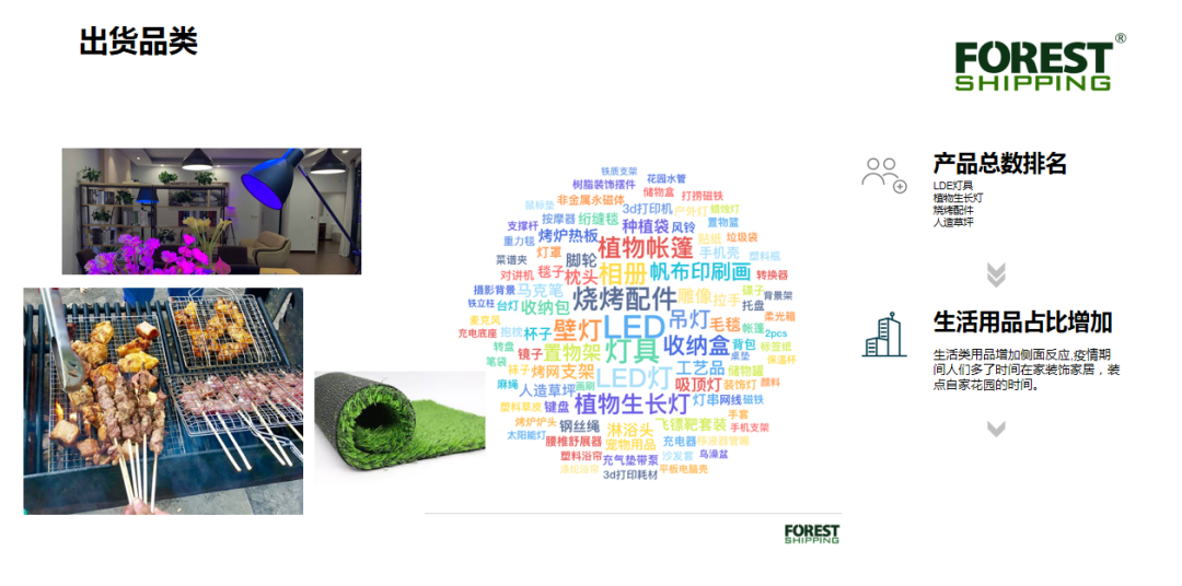 另外从出货的品类来看,我们的出货品名常出现的是室内生活用品的增加,比如您看到的出现频率非常高的LED灯,烧烤配件,植物生长灯,收纳盒,人造草坪,生活类用品增加侧面反应,疫情期间人们有了更多的时间在家装饰家居,装点自家花园。通过这个品类图我们作为物流公司可以更有方向的寻找我们的客户。