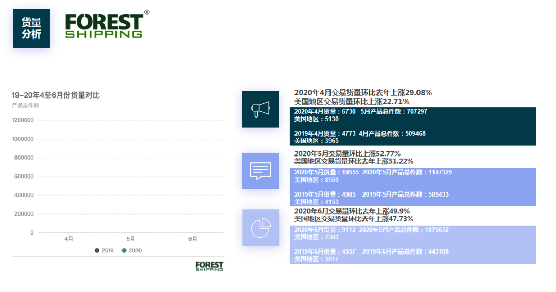 同比2019年我们美国拼箱的出货数据都是增长态势,2020年4月美国地区交易货量环比上涨22.71%,2020年5月美国地区交易货量环比去年上涨51.22%,2020年6月美国地区交易货量环比去年上涨47.73%