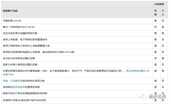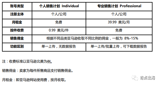 亚马逊的账号类型主要分为两种,个人销售计划和专业销售计划。我们可以先通过下方的亚马逊北美站销售计划主要收费项目比对表来简单地了解一下两种账号类型的区别。