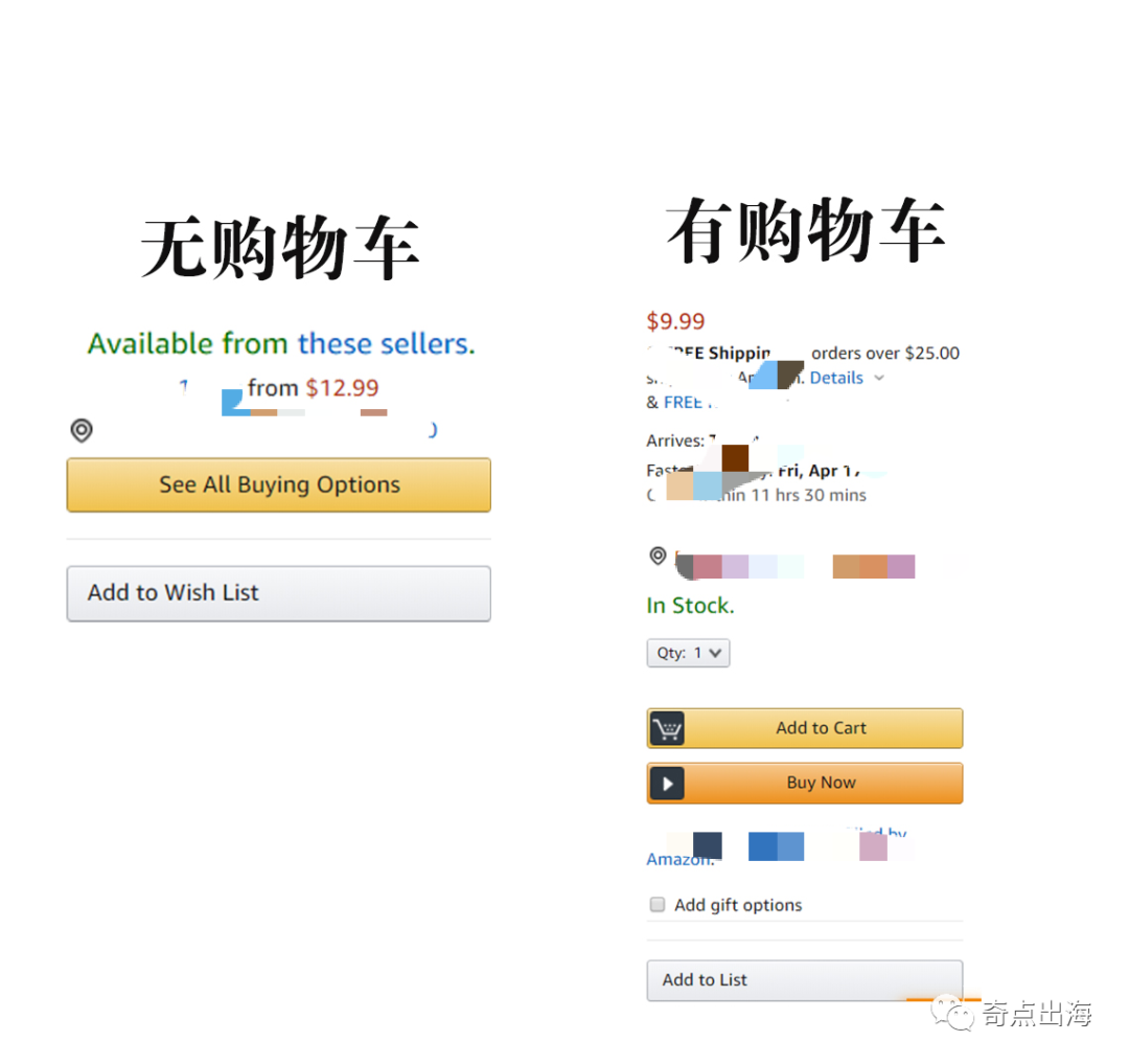 上面这张表我们就个重点来看看,个人销售计划没有资格获得购物按钮!这是什么概念?没有Buy Box,你的商品界面是像左边这样子的,而获得了购物车,是像右边这样子显示的:
