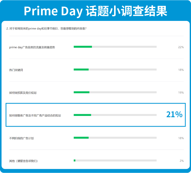 针对之前关于Prime Day的话题调查中,最多卖家选择的【广告品类的流量及销量趋势】,广告君已专题放送!今天,我们来发布,另一个受卖家们欢迎的话题【面对广告产品库中的各员大将,如何进行“排兵布阵”!】