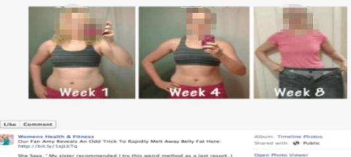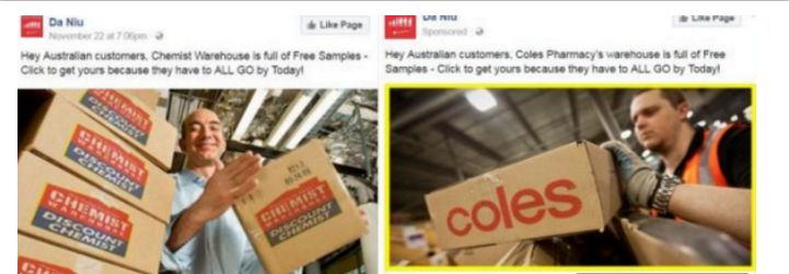 首先,在产品层面上,一些在Facebook平台中的不法广告商冒充品牌厂商,提供虚假产品类广告进行诈骗,这类广告常常配有价格方面优惠,以及”Limited Supply”(限量出售)等字眼,以便营造出一种供应紧张的气氛,进而吸引消费者。当消费者点击广告后,则会跳转到与广告内容不相符的产品购买页面中,如不能及时发现,消费者就会落入商家圈套。 (图1:出现在Facebook平台内涉及Limited Supply产品的虚假广告) 用户点击后,则会跳转到其他网站,进而被要求提供个人信用卡信息进行支付。因此,Chemist Warehouse遭到了大量用户投诉。但由于这家公司之前并没有与Facebook有过合作,外媒在报道Facebook的回应时这样写道:“在掌握全部细节后,平台才能采取适当的措施应对。” 其次,在内容层面,不少广告商在热点问题、公众事件以及花边新闻等内容上,借题发挥,用虚假的、但博人眼球的内容把广告包装成“故事”,进而骗取用户信息或增加流量。 03.反映产品使用前后对比内容