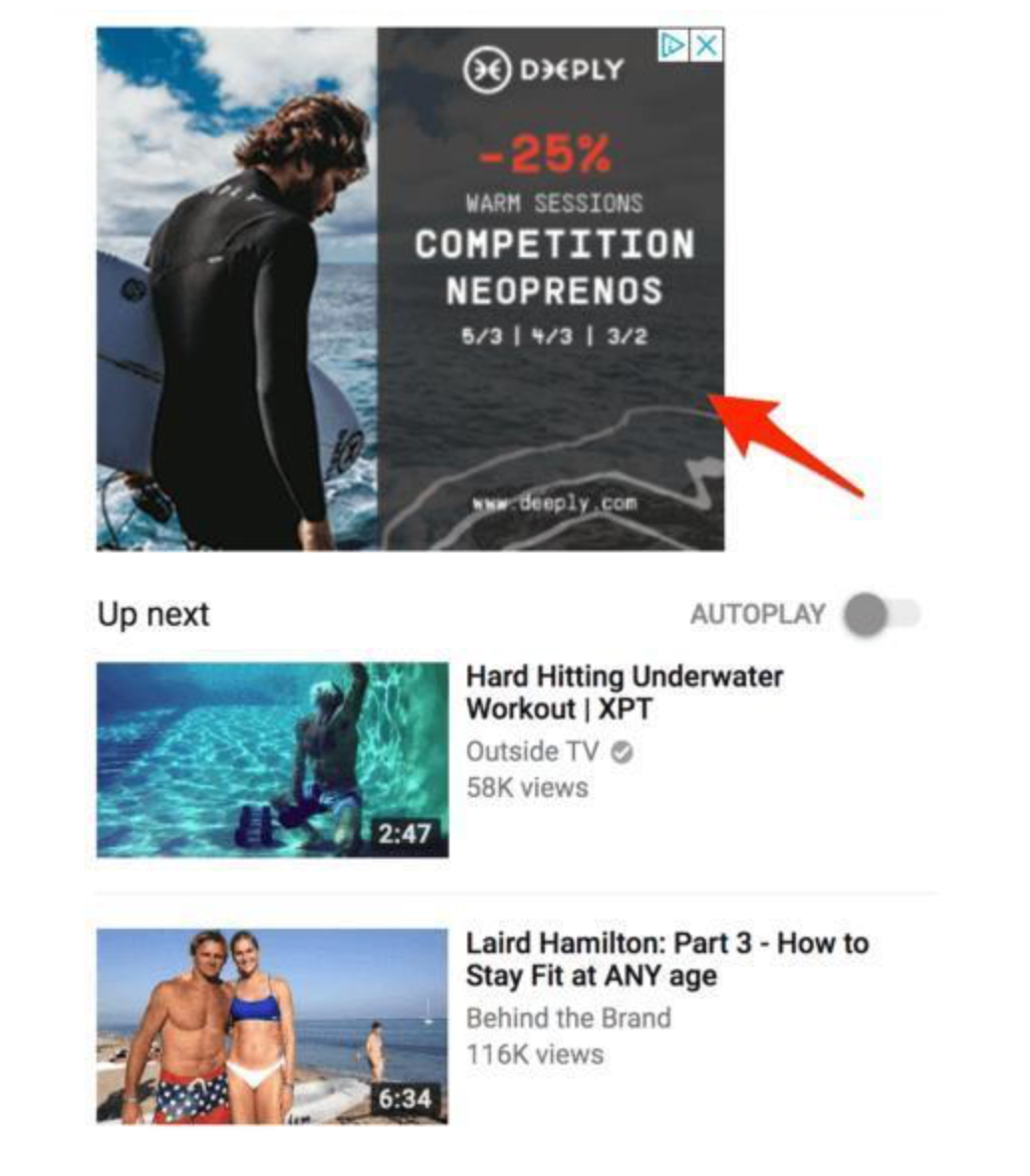 如果您不想在视频中投放广告,那么展示广告是您最好的选择。广告会显示在视频的右侧和视频建议列表的上方。对于活跃用户,此广告可能会显示在播放器下方。这种广告形式只适用于桌面端。
